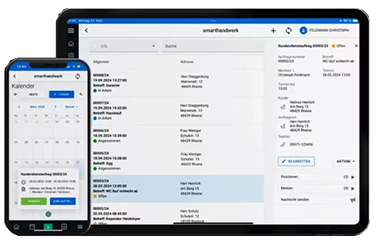 Mit unserer App für Handwerker haben Sie bereits im kleinsten Paket eine umfangreiche Ausstattung, die Sie im Alltag unterstützt. Ein morgendlicher Blick in den Terminkalender, der Ihnen die Kundentermine für den Tag übersichtlich in einer Liste darstellt, verschafft Ihnen den benötigten Überblick bevor Sie sich ganz bequem aus der App heraus zu Ihrem ersten Kunden navigieren lassen. Vor Ort angekommen können nochmal schnell die Details zum Kunden und Auftrag eingesehen werden, bevor die eigentliche Arbeit beginnt. Weitere Vorteile der smarthandwerk App im Überblick Nutzen Sie die Vorteile des mobilen Arbeitens bei Ihren Kunden vor Ort und sparen Sie sich wertvolle Zeit und eine unnötige Zettelwirtschaft. Machen Sie den Schritt und digitalisieren Sie Ihr Unternehmen mit den cleveren Erweiterungen unserer Handwerker App und Ihr smarthandwerk.